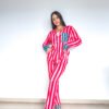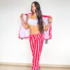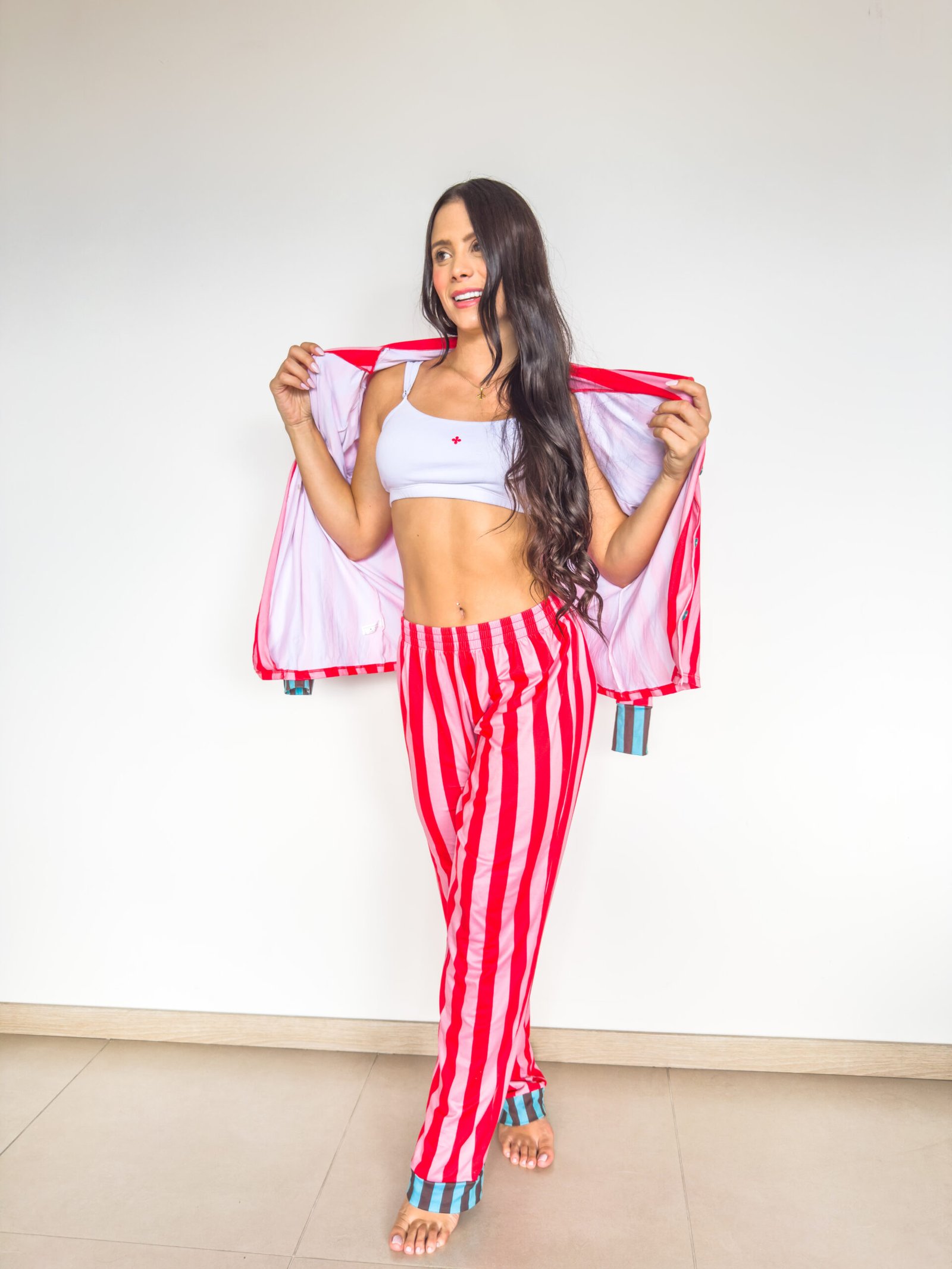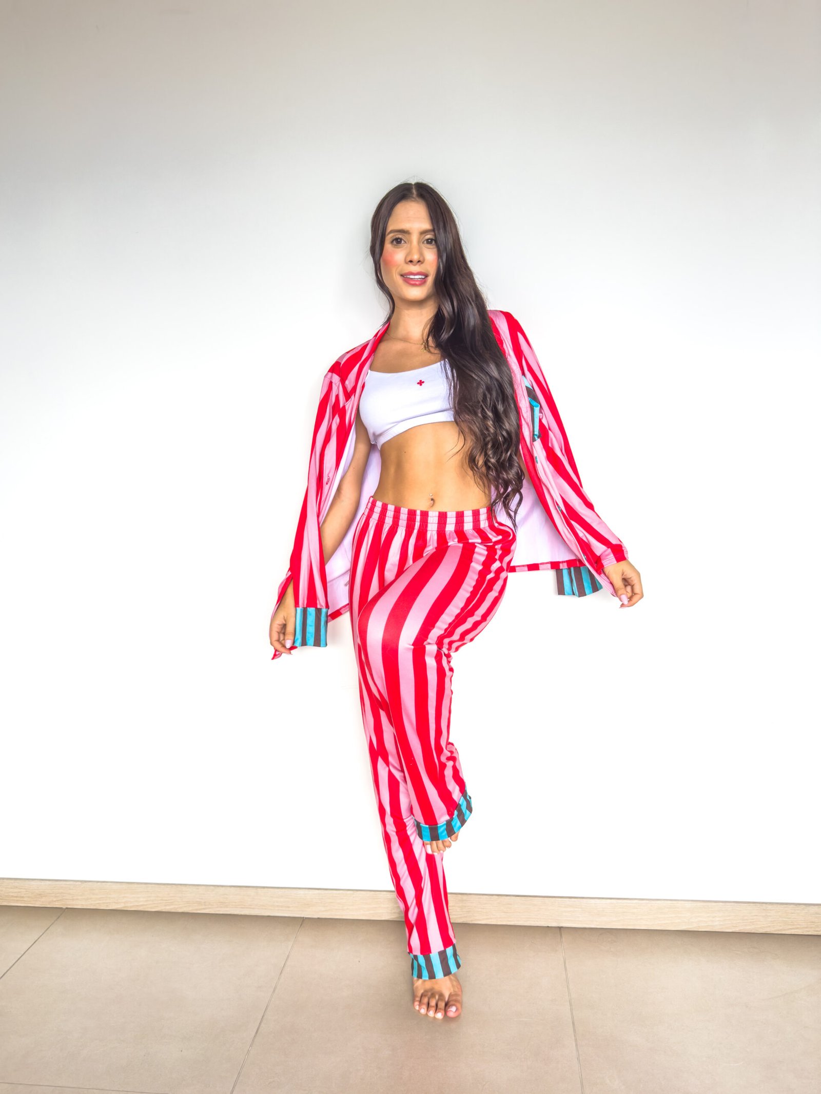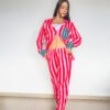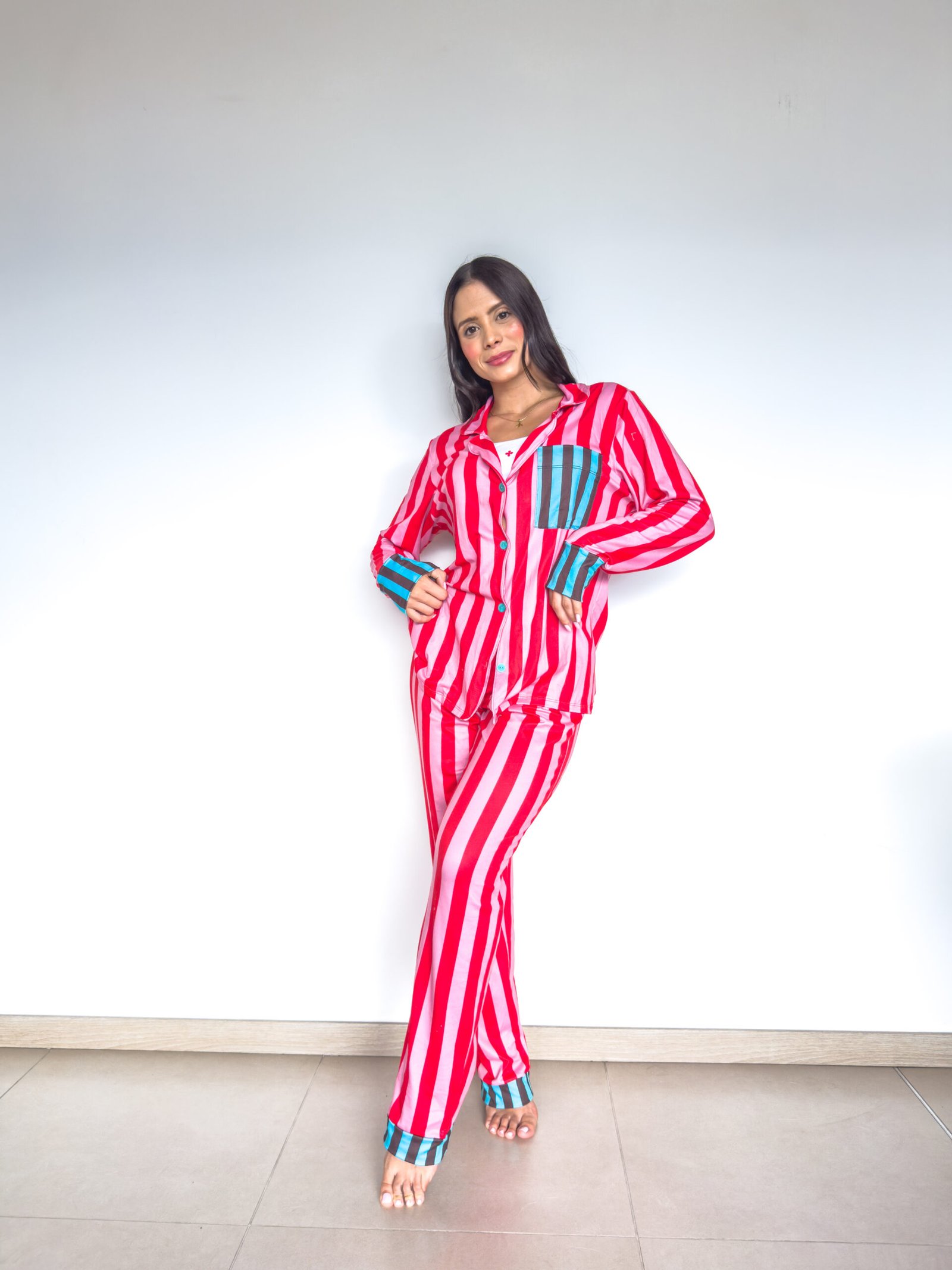 Confeccionado en una tela suave, ligera y transpirable, este conjunto garantiza una sensación de confort durante todo el día o la noche. Sus rayas verticales en tonos vivos aportan un toque divertido y chic, ideal para quienes disfrutan de la moda incluso en los momentos de descanso.
